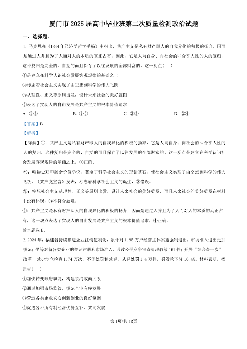福建省厦门市2024-2025学年高三第二次质量检测(二模)政治(精品解析版)