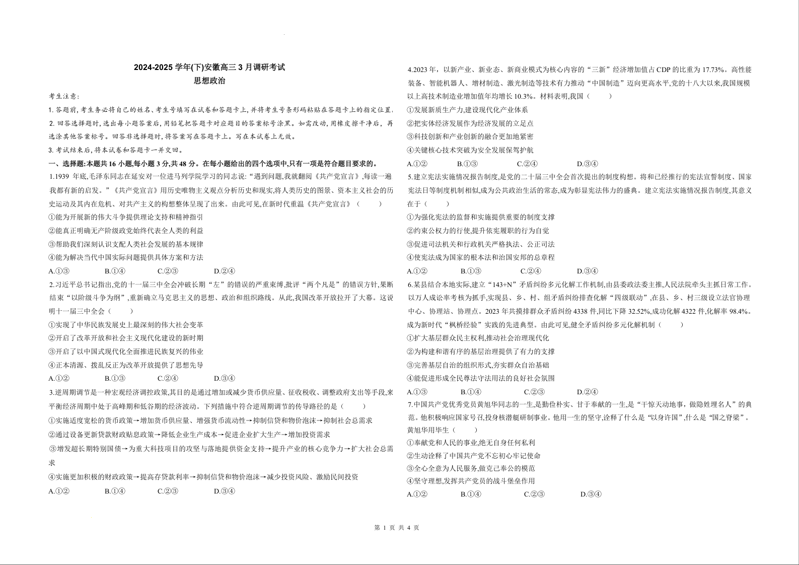 安徽省区域高中2024-2025学年下学期3月高三调研考试政治