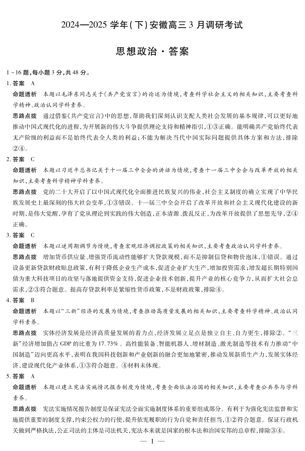 安徽省区域高中2024-2025学年下学期3月高三调研考试政治答案