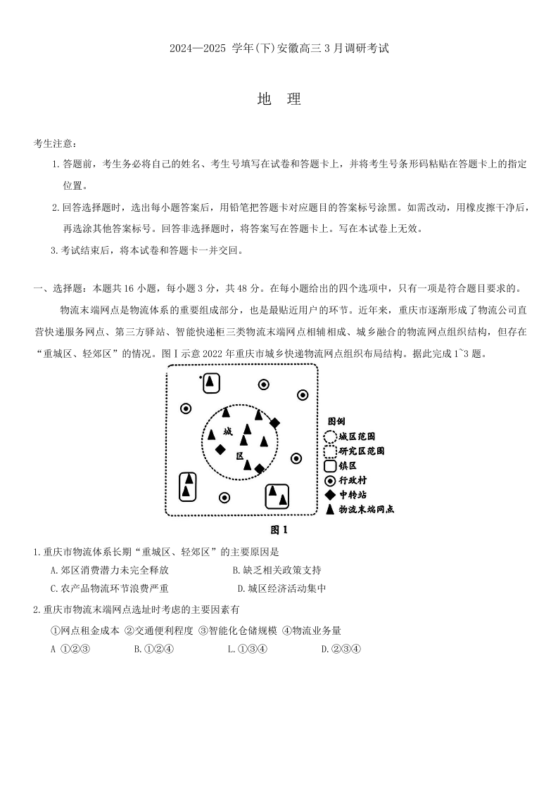 安徽省区域高中2024-2025学年下学期3月高三调研考试地理