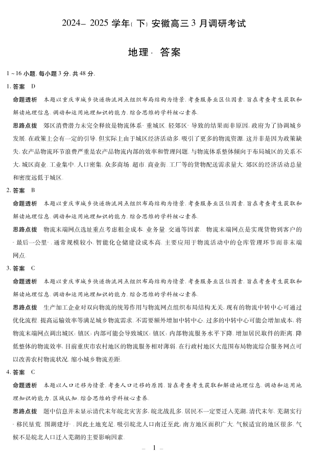 安徽省区域高中2024-2025学年下学期3月高三调研考试地理答案