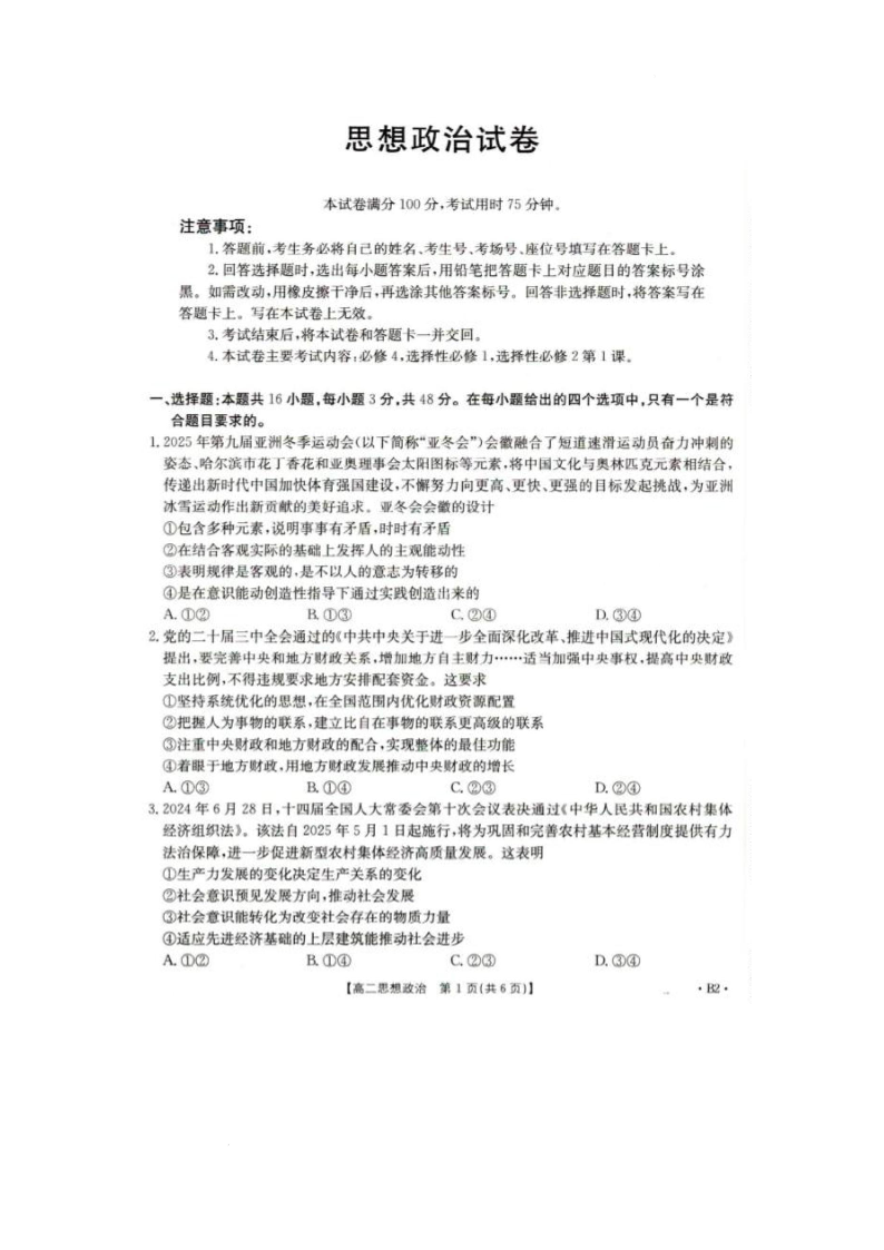 辽宁省抚顺市六校协作体2024-2025学年下学期高二期初检测政治