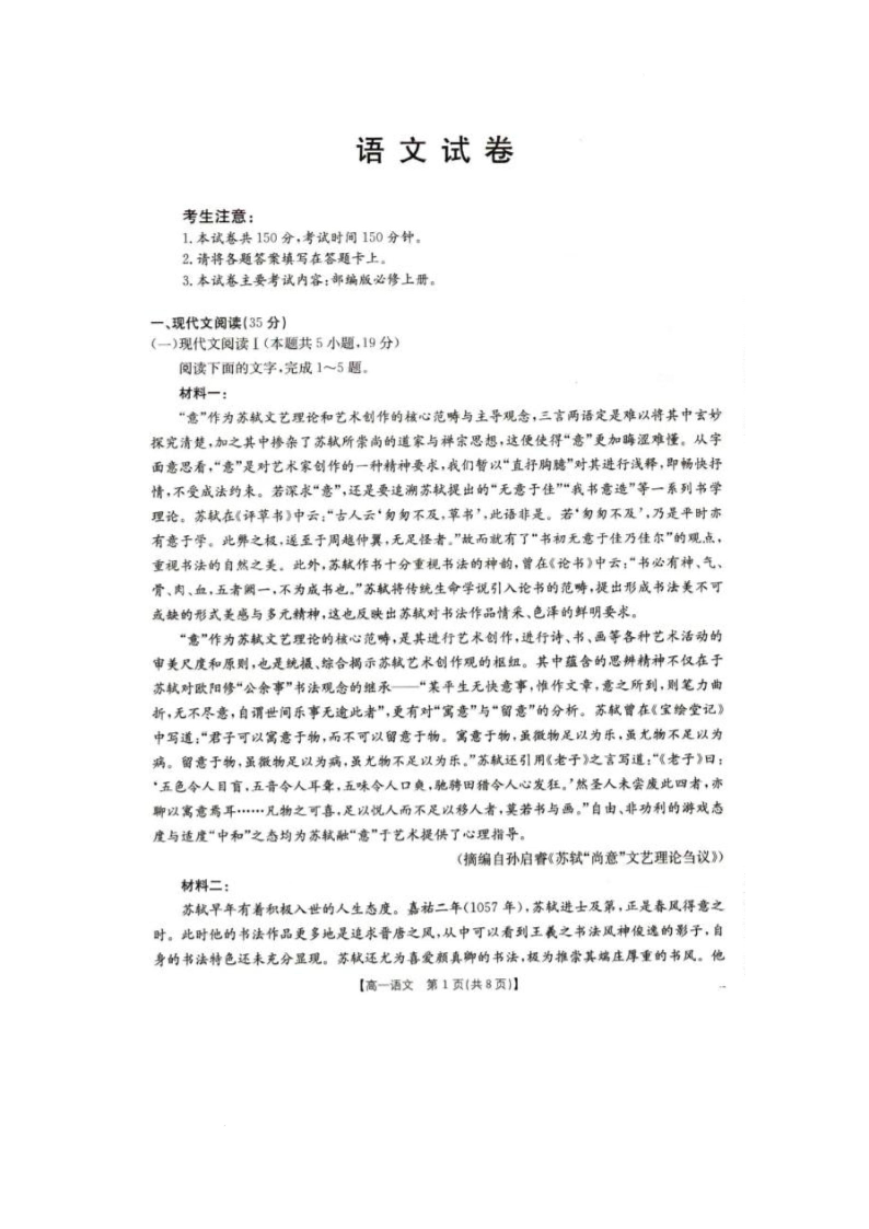 辽宁省抚顺市六校协作体2024-2025学年下学期高一期初检测语文
