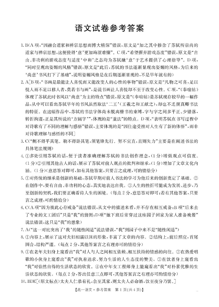 辽宁省抚顺市六校协作体2024-2025学年下学期高一期初检测语文答案