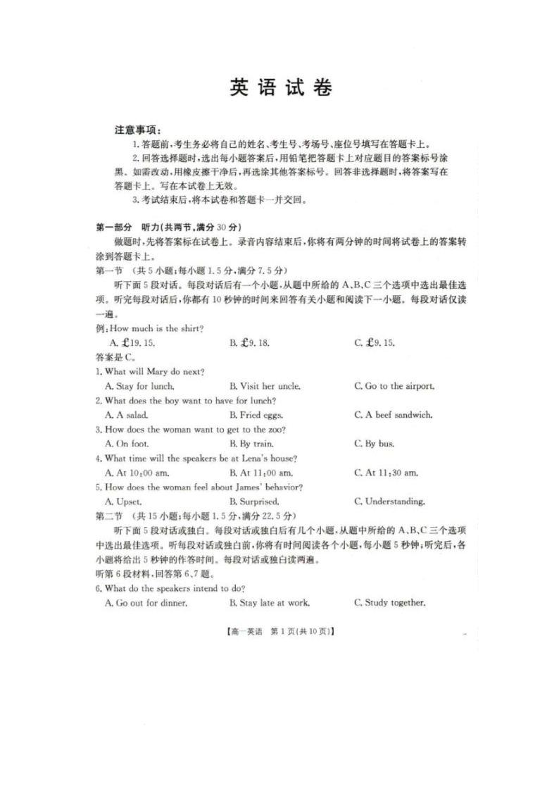 辽宁省抚顺市六校协作体2024-2025学年下学期高一期初检测英语