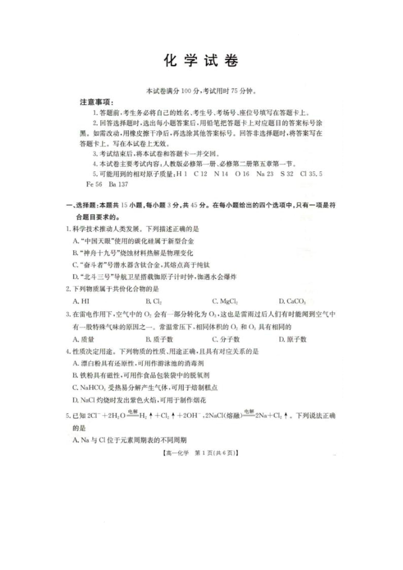 辽宁省抚顺市六校协作体2024-2025学年下学期高一期初检测化学