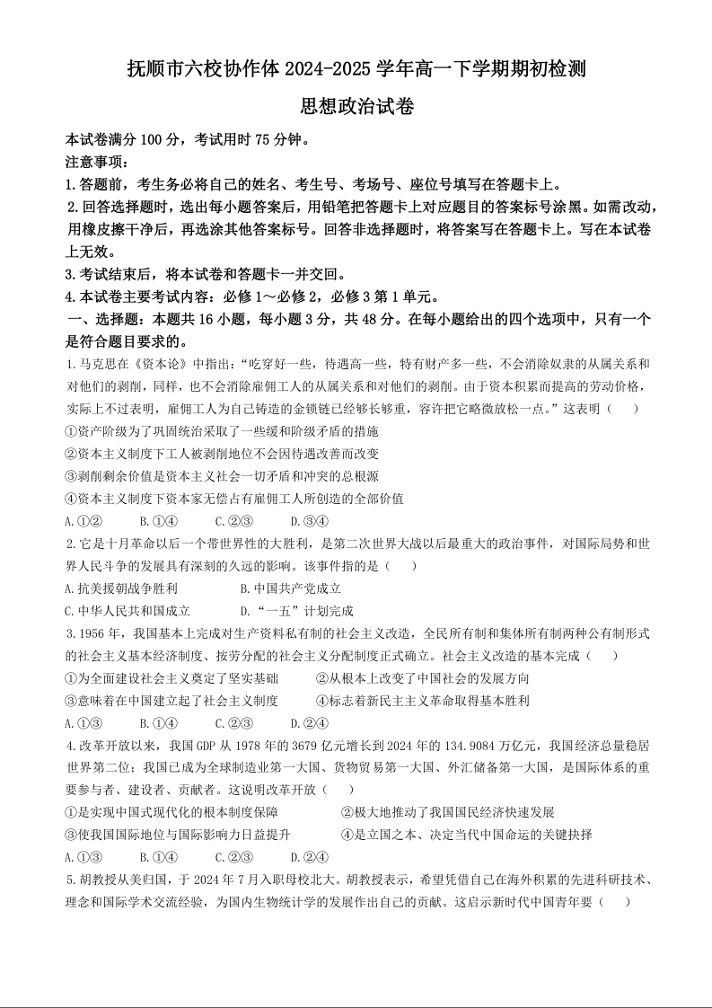 辽宁省抚顺市六校协作体2024-2025学年下学期高一期初检测政治+答案
