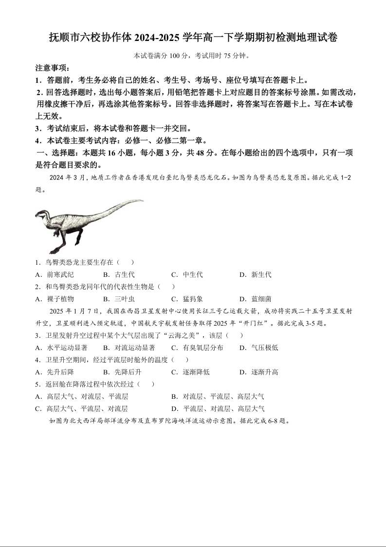 辽宁省抚顺市六校协作体2024-2025学年下学期高一期初检测地理+答案