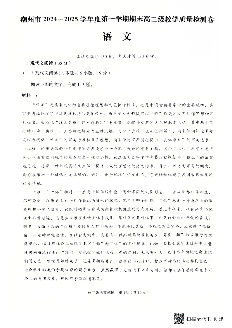 广东省潮州市2024-2025学年高二上学期1月期末考试语文