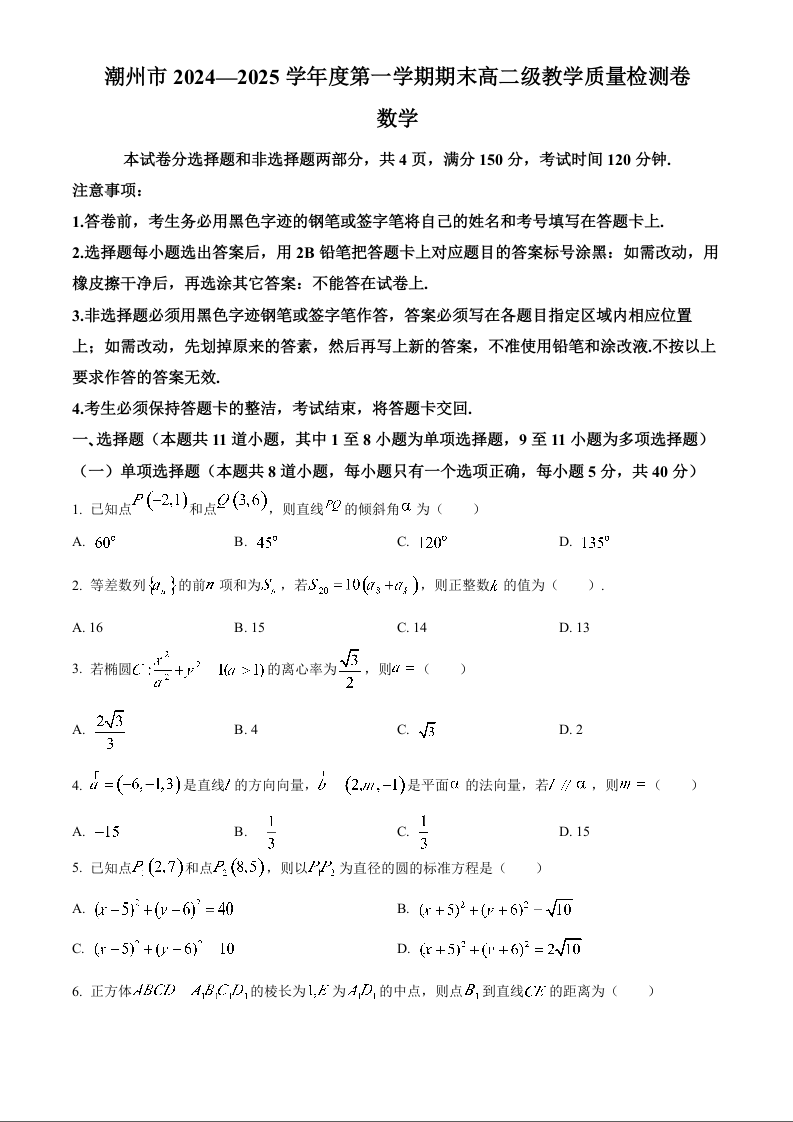 广东省潮州市2024-2025学年上学期1月高二期末考试数学(原卷版)