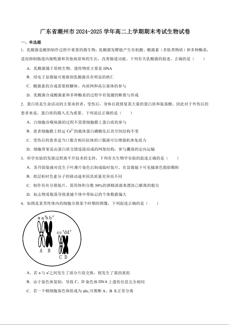 广东省潮州市2024-2025学年上学期1月高二期末考试生物+答案