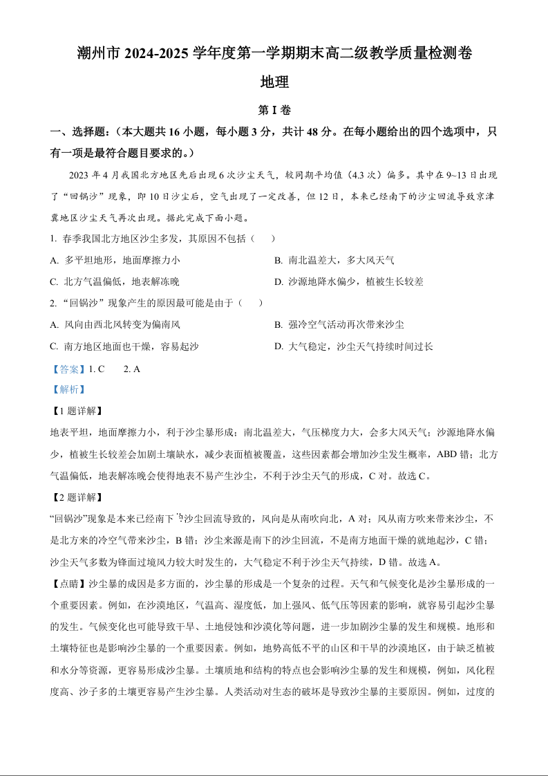 广东省潮州市2024-2025学年上学期1月高二期末考试地理(解析版)