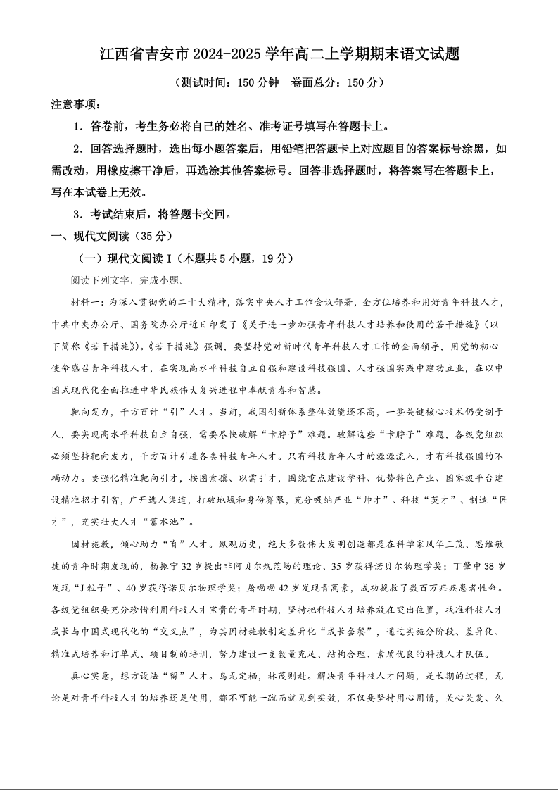 江西省吉安市2024-2025学年上学期1月高二期末考试语文(解析版)
