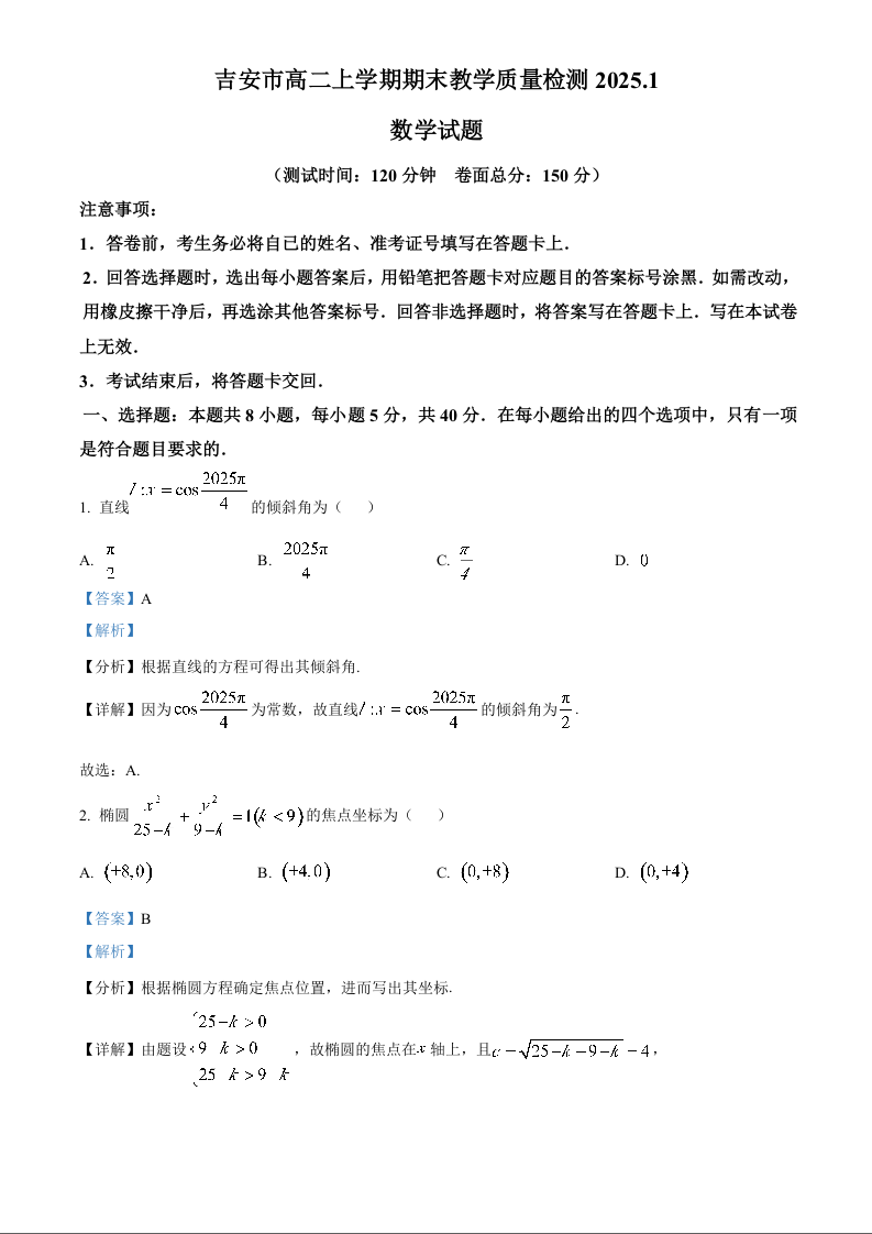 江西省吉安市2024-2025学年上学期1月高二期末考试数学(解析版)