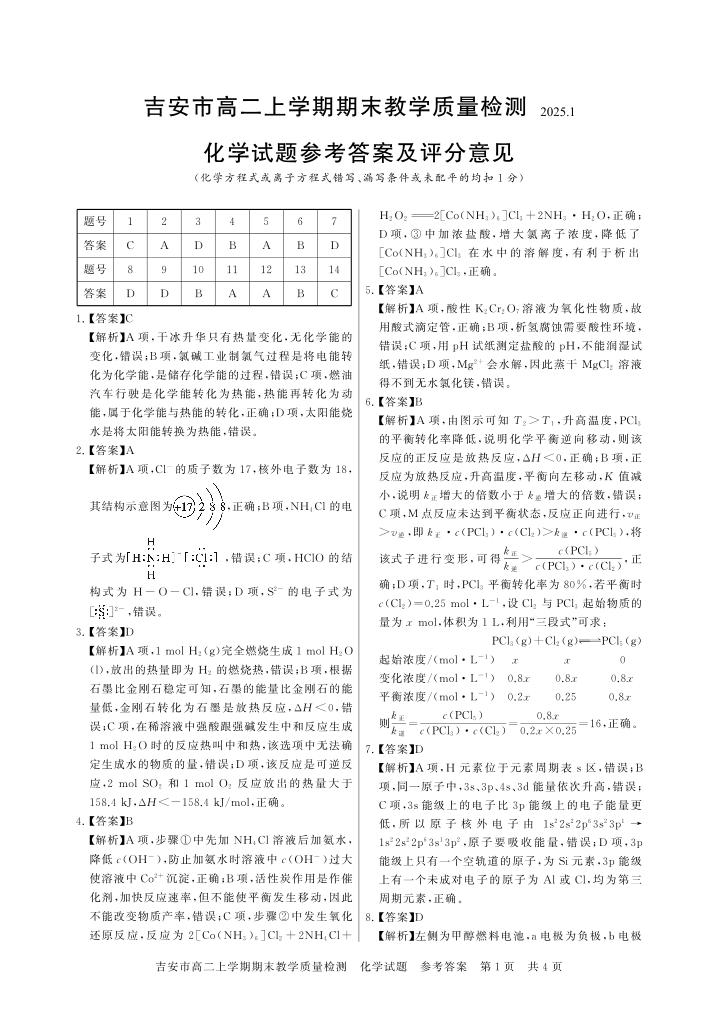 江西省吉安市2024-2025学年上学期1月高二期末考试化学答案