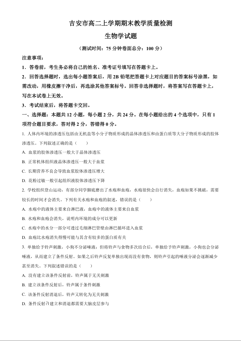 江西省吉安市2024-2025学年上学期1月高二期末考试生物+答案