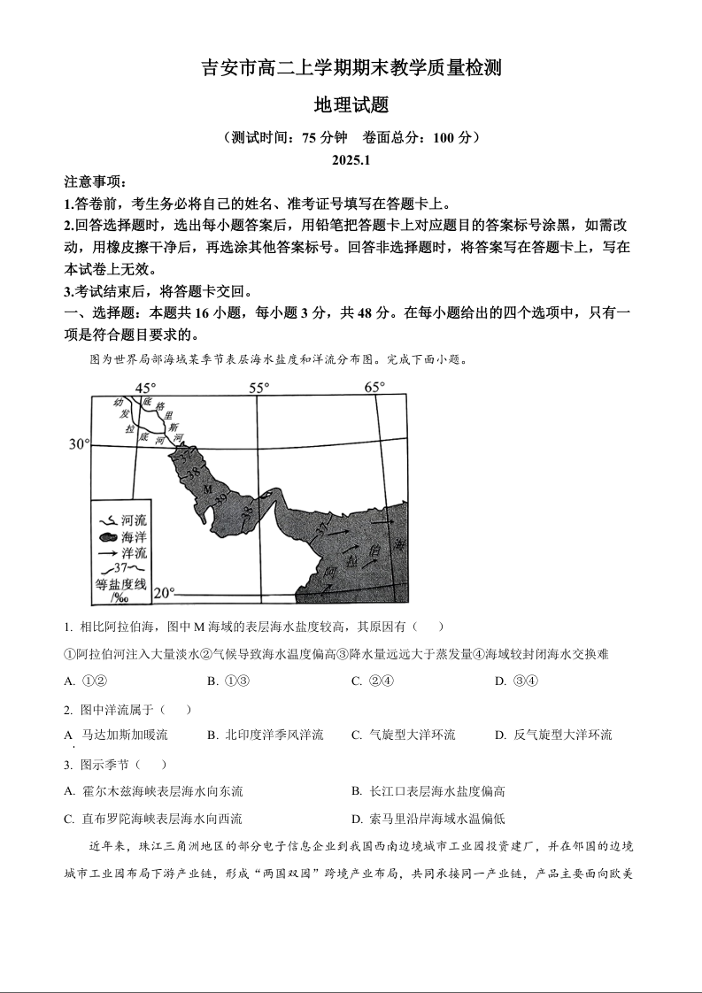 江西省吉安市2024-2025学年上学期1月高二期末考试地理+答案