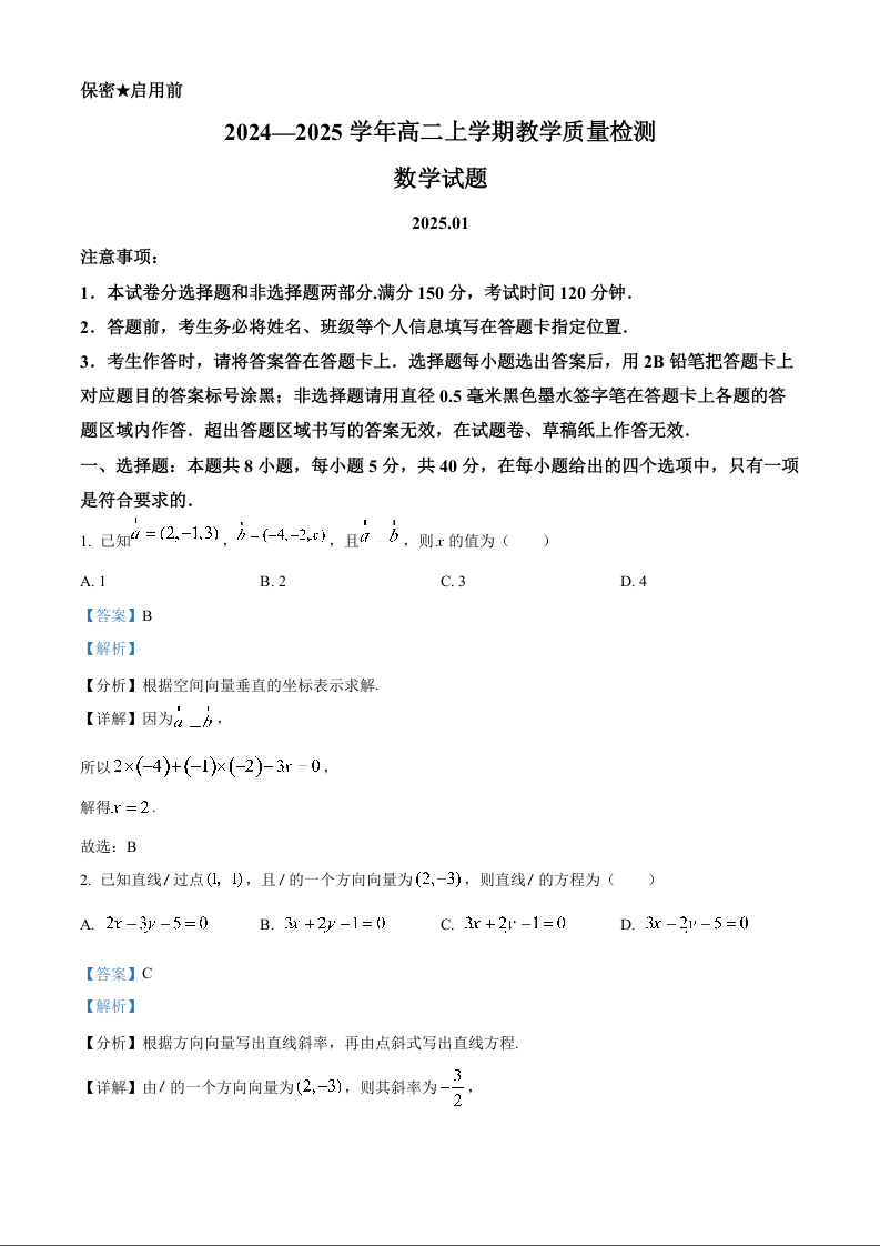 山东省菏泽市2024-2025学年上学期1月高二期末考试数学(解析版)