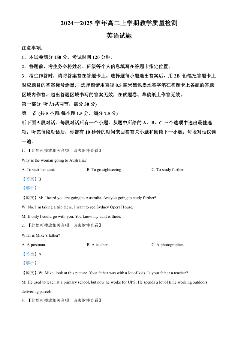 山东省菏泽市2024-2025学年上学期1月高二期末考试英语(解析版)