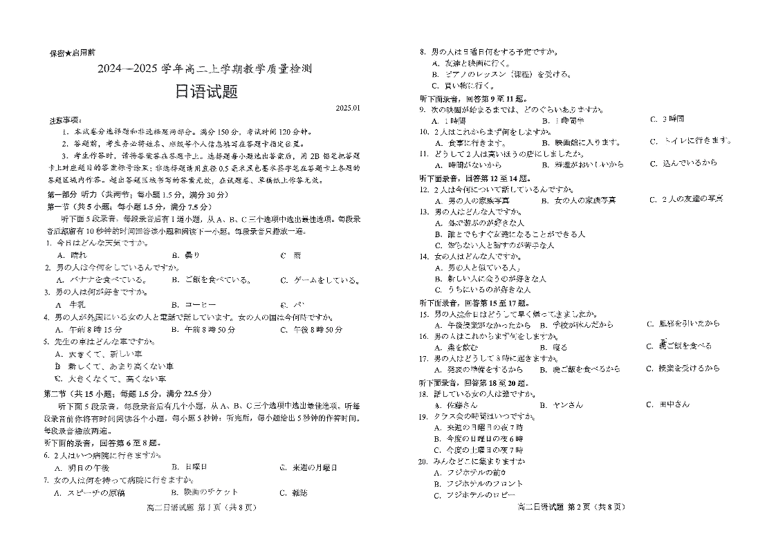 山东省菏泽市2024-2025学年上学期1月高二期末考试日语