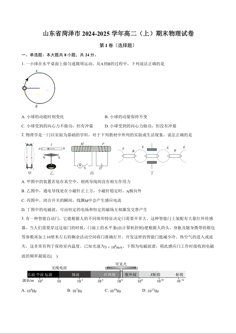 山东省菏泽市2024-2025学年上学期1月高二期末考试物理+答案