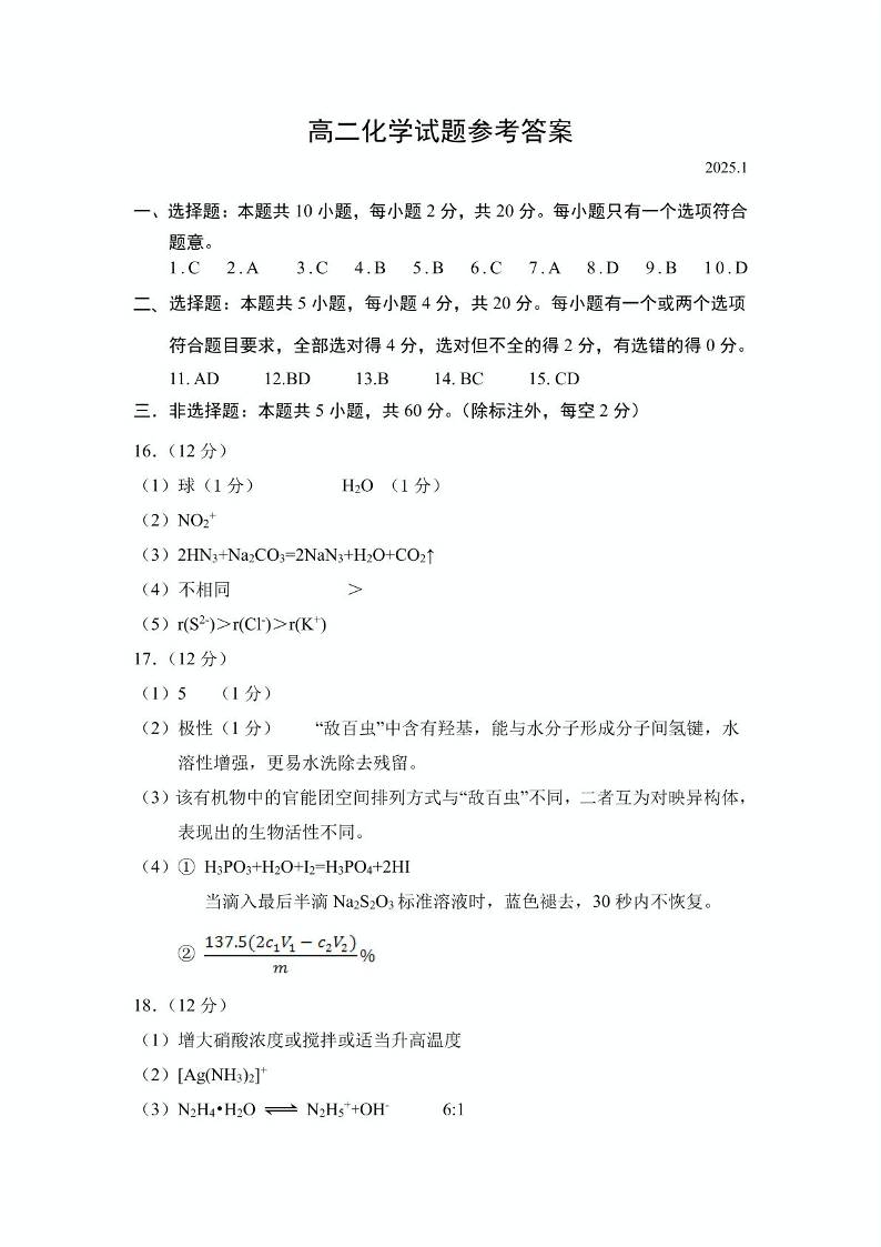 山东省菏泽市2024-2025学年上学期1月高二期末考试化学答案