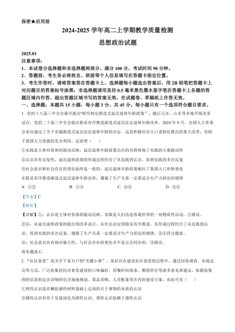 山东省菏泽市2024-2025学年上学期1月高二期末考试政治(解析版)