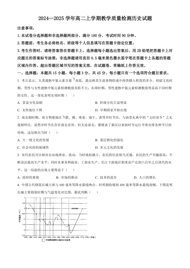 山东省菏泽市2024-2025学年上学期1月高二期末考试历史(原卷版)