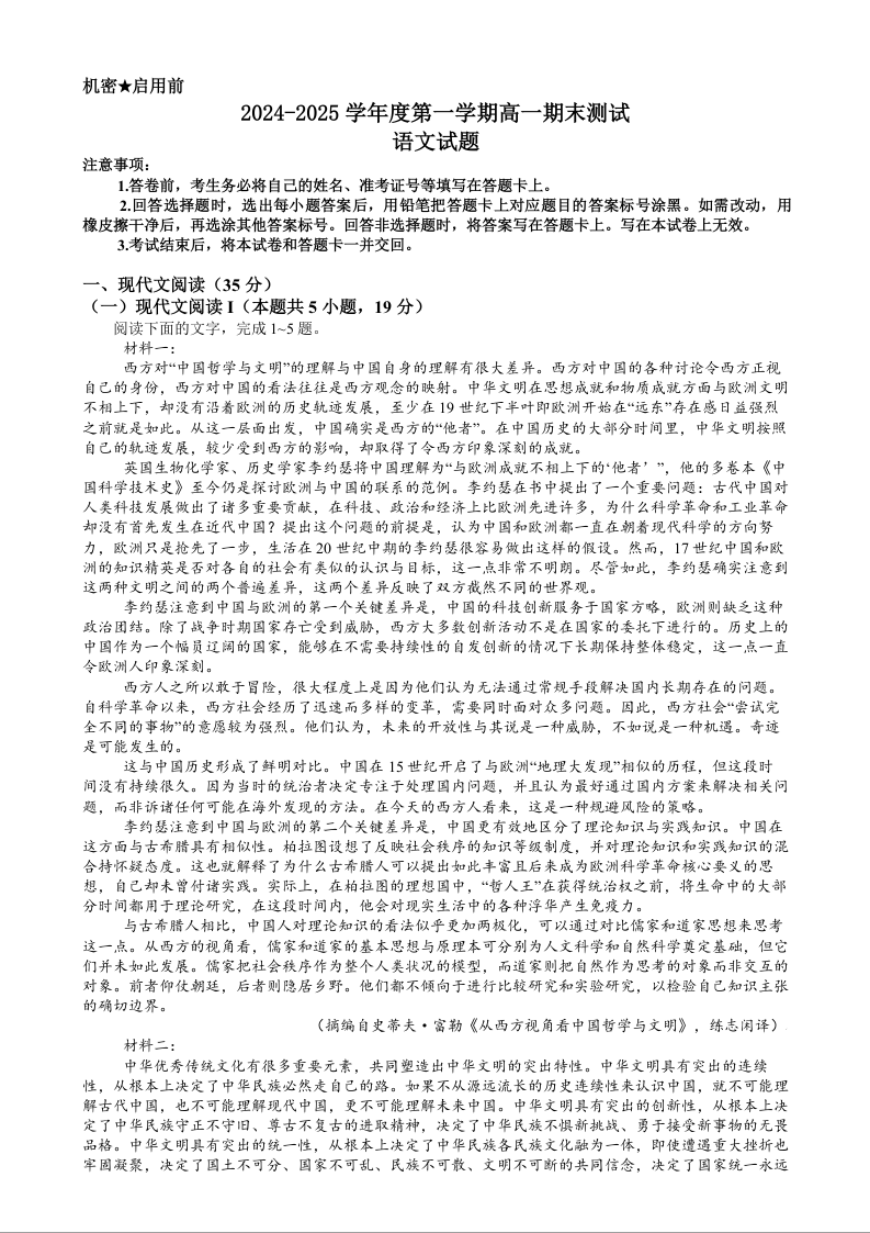 广东省阳江市高新区2024-2025学年上学期1月高一期末考试语文+答案
