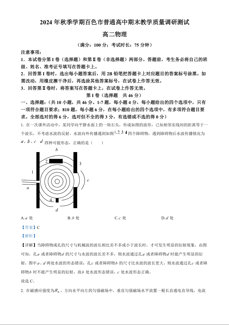 广西壮族自治区百色市2024-2025学年上学期1月高二期末考试物理(解析版)