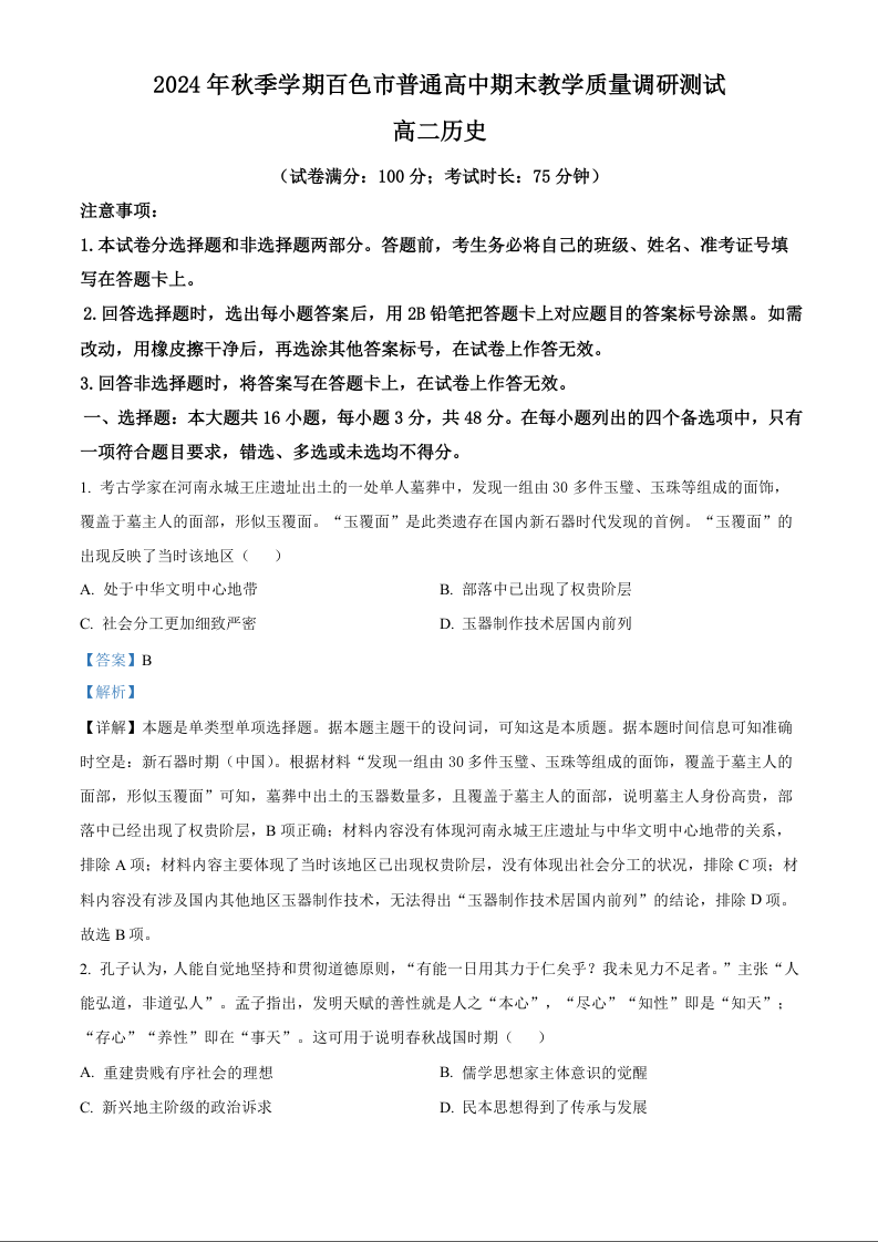 广西壮族自治区百色市2024-2025学年上学期1月高二期末考试历史(解析版)