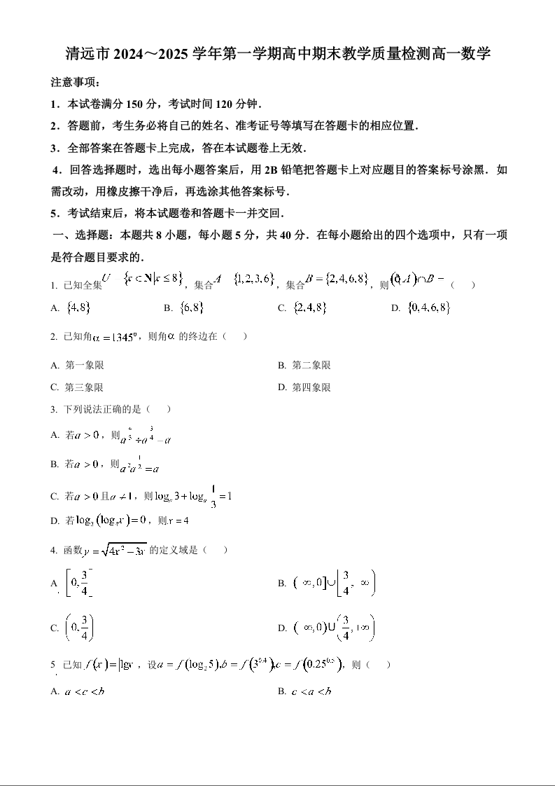广东省清远市2024-2025学年上学期1月高一期末考试数学(原卷版)
