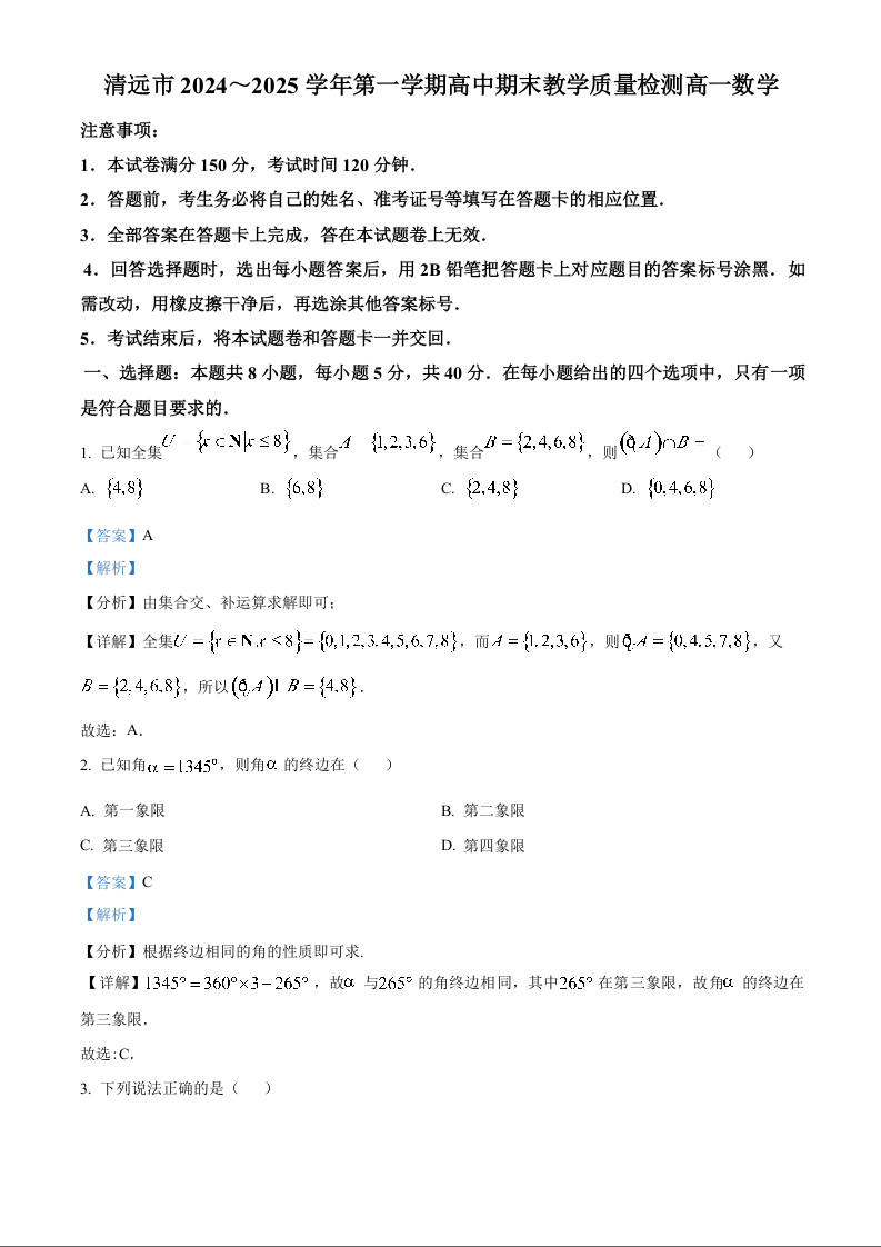 广东省清远市2024-2025学年上学期1月高一期末考试数学(解析版)
