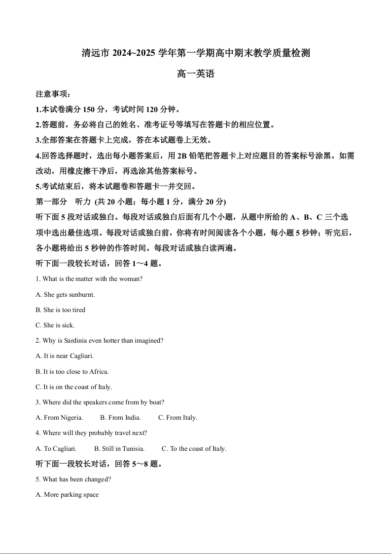 广东省清远市2024-2025学年上学期1月高一期末考试英语(解析版)