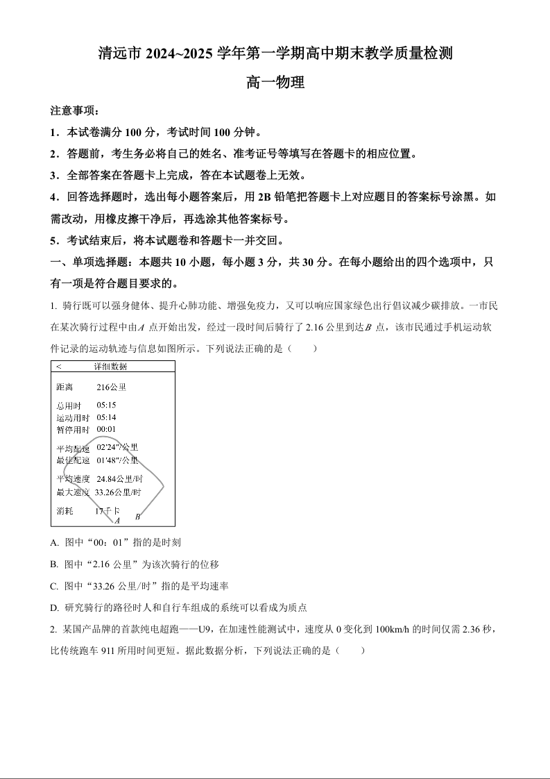 广东省清远市2024-2025学年上学期1月高一期末考试物理(原卷版)