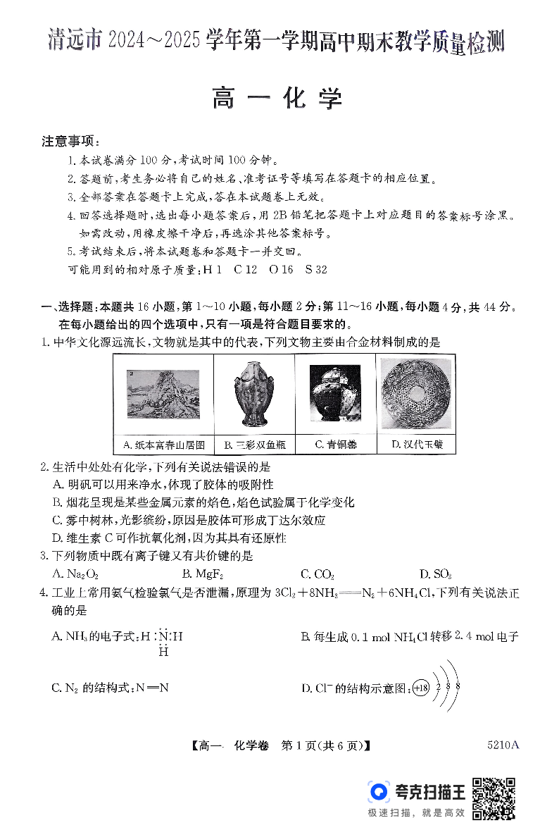 广东省清远市2024-2025学年上学期1月高一期末考试化学