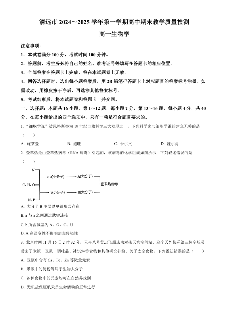 广东省清远市2024-2025学年上学期1月高一期末考试生物(原卷版)