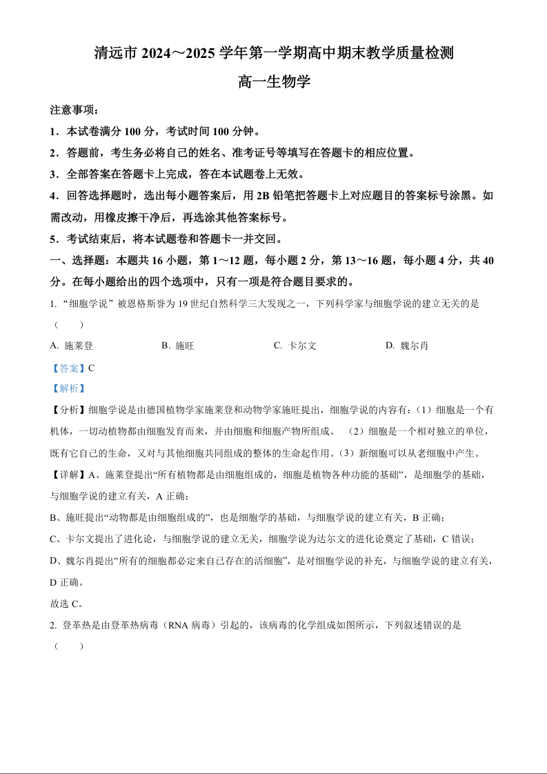 广东省清远市2024-2025学年上学期1月高一期末考试生物(解析版)