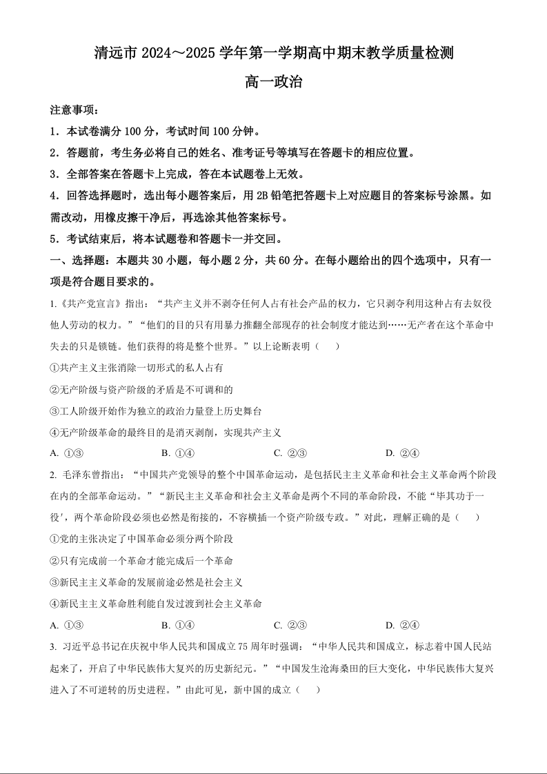 广东省清远市2024-2025学年上学期1月高一期末考试政治(原卷版)
