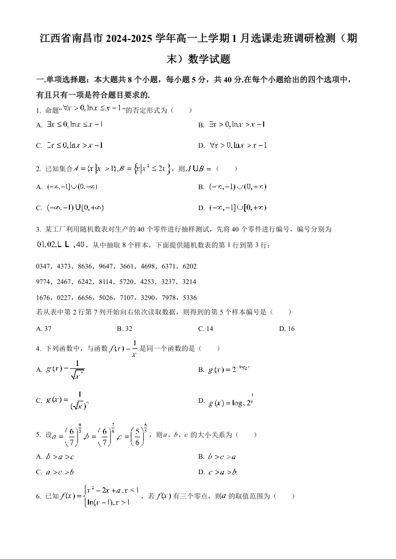 江西省南昌市2024-2025学年上学期1月高一期末考试数学(原卷版)