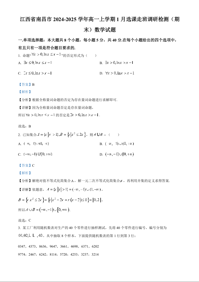 江西省南昌市2024-2025学年上学期1月高一期末考试数学(解析版)