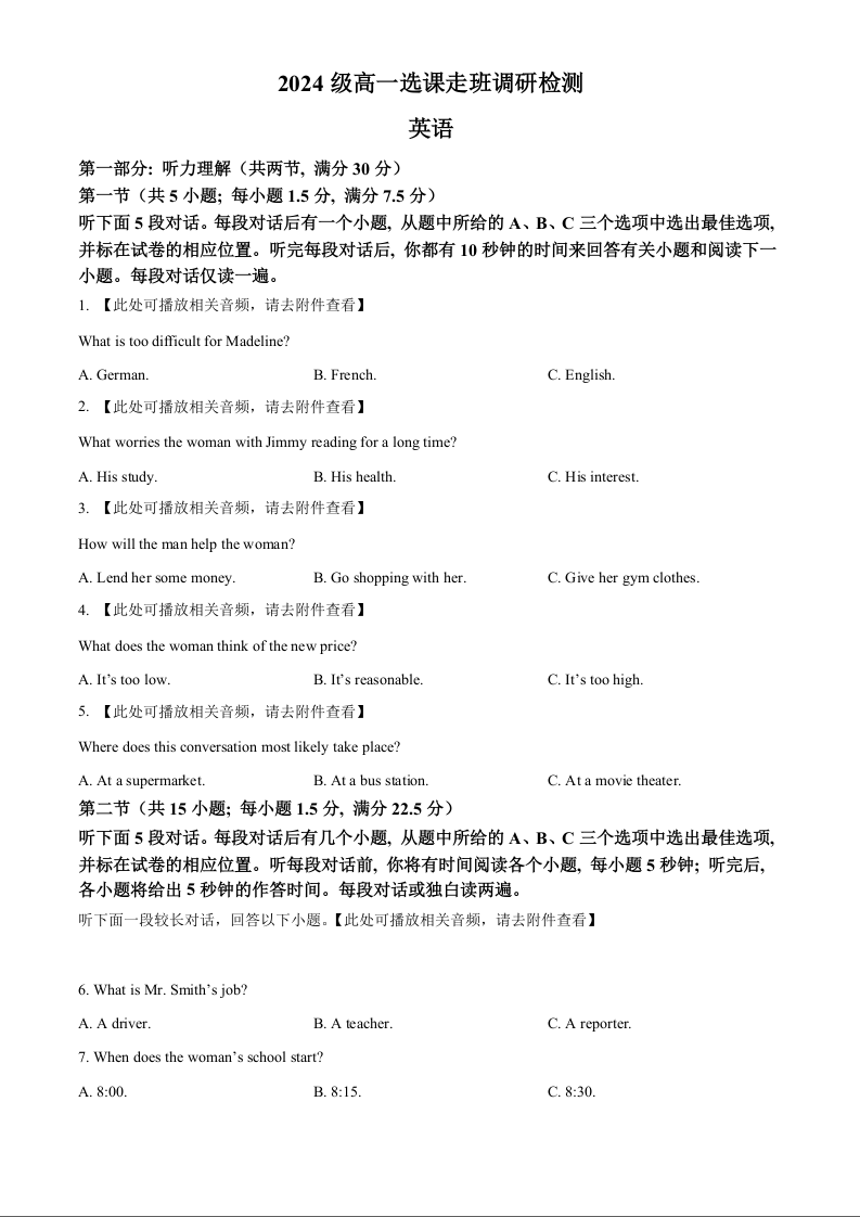 江西省南昌市2024-2025学年上学期1月高一期末考试英语(原卷版)