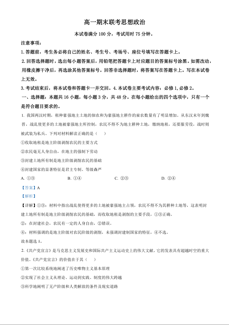 山西省晋城市2024-2025学年上学期1月高一期末考试政治(解析版)
