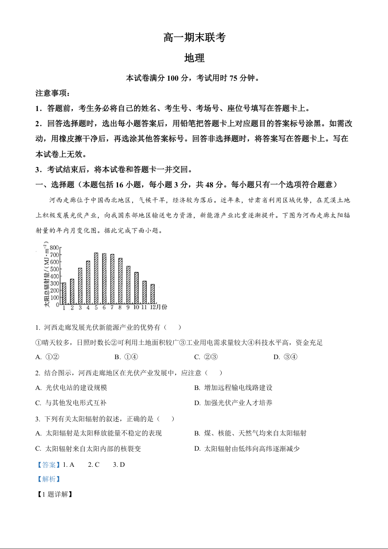 山西省晋城市2024-2025学年上学期1月高一期末考试地理(解析版)