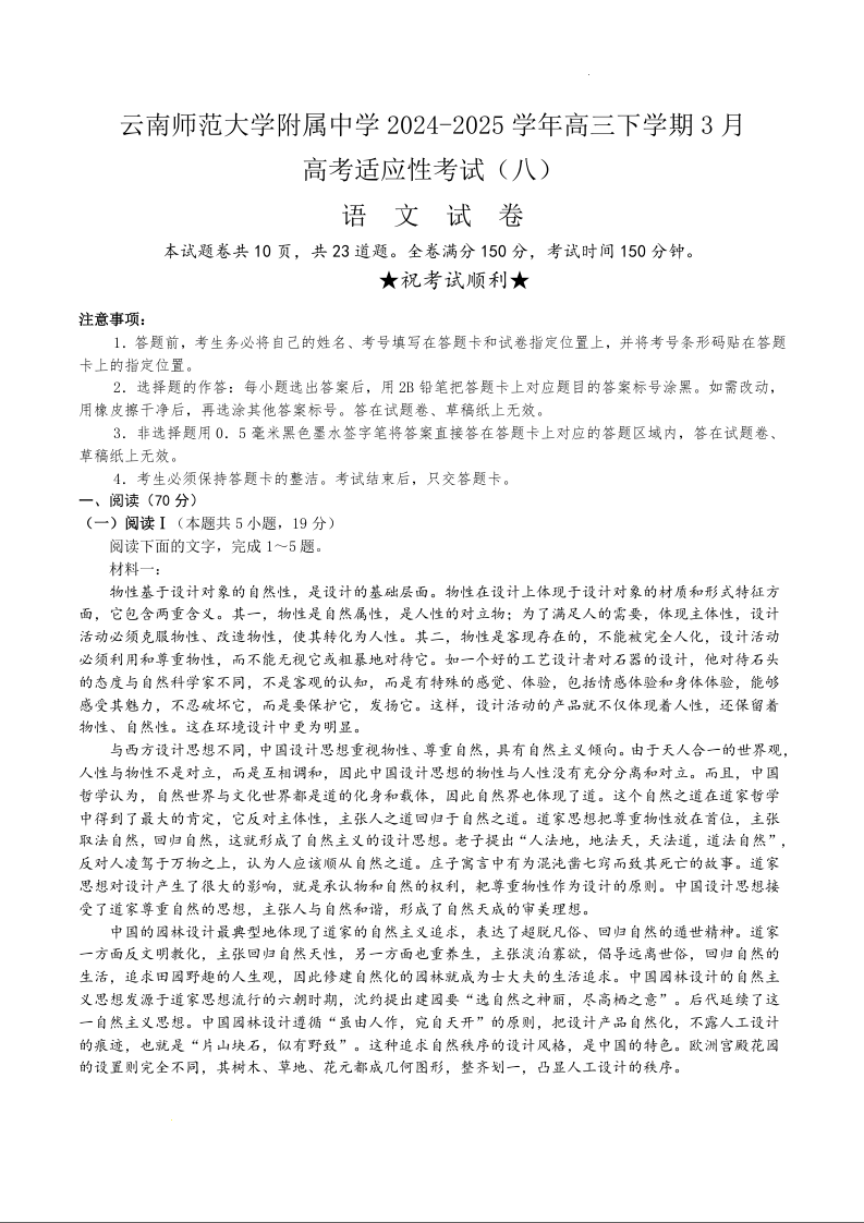云南师大附中2025届高三下学期3月高考适应性月考卷(八)语文+答案