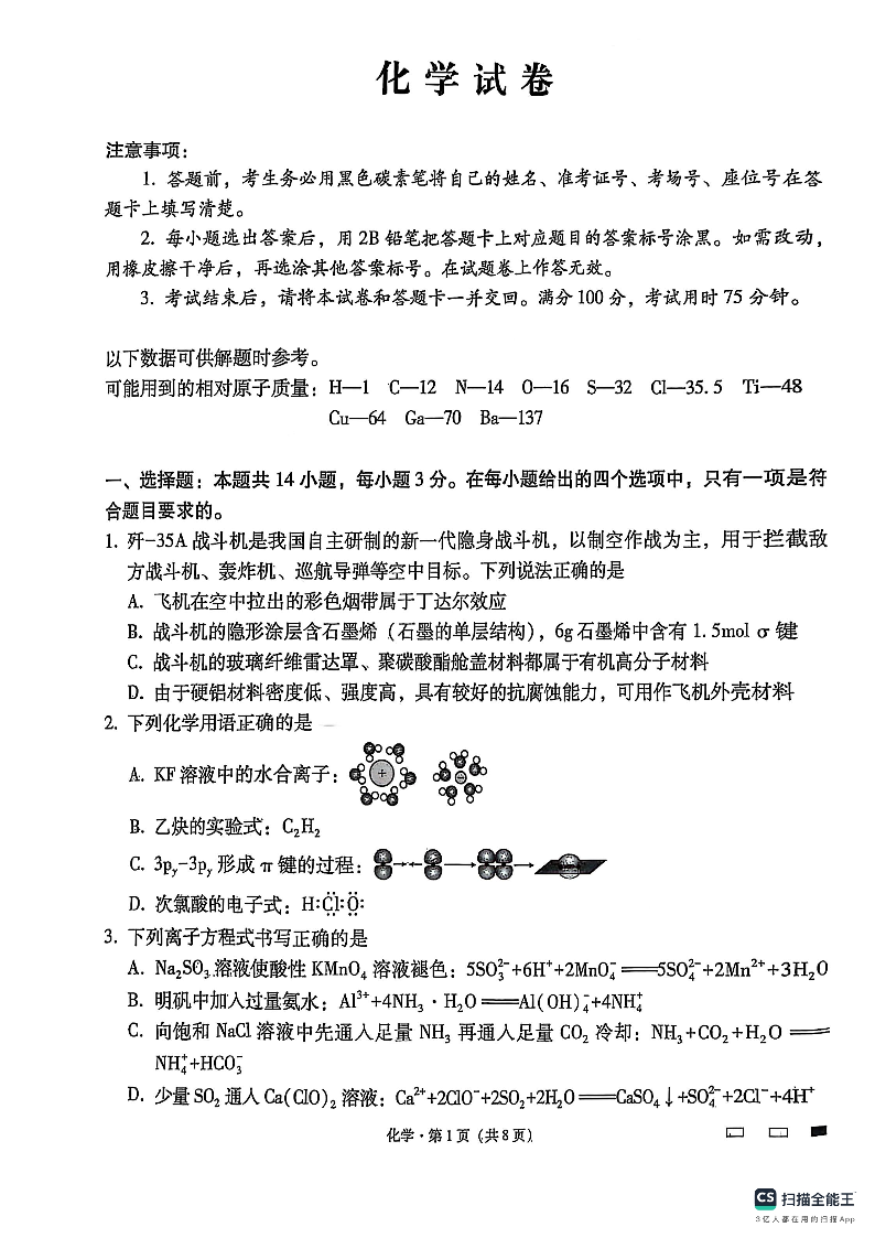 云南师大附中2025届高三下学期3月高考适应性月考卷(八)化学