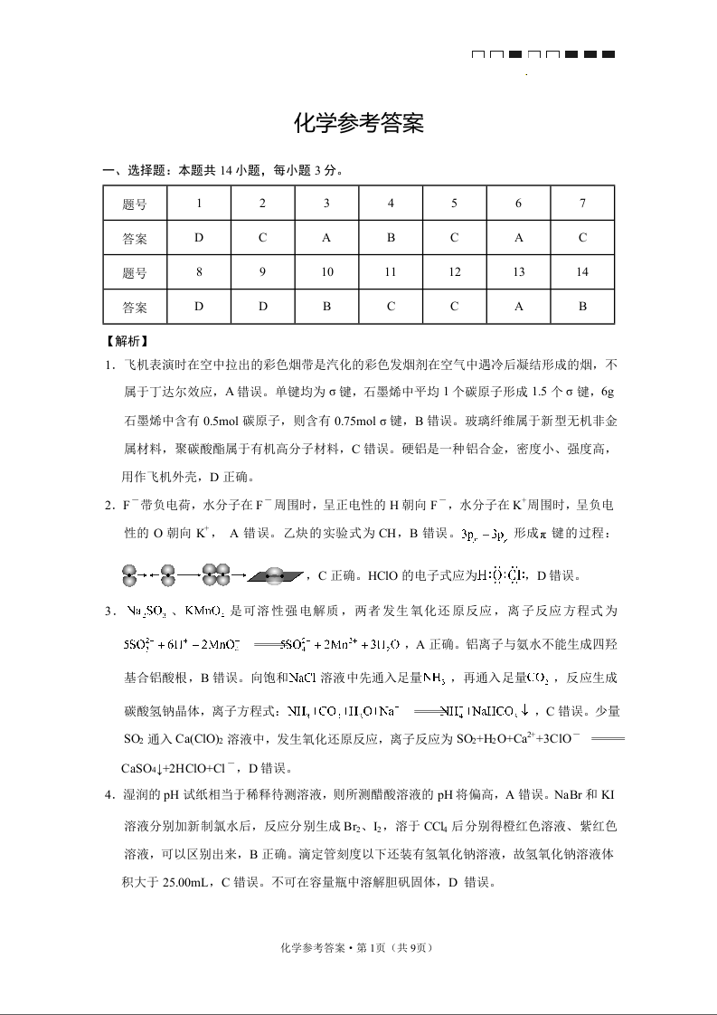 云南师大附中2025届高三下学期3月高考适应性月考卷(八)化学答案