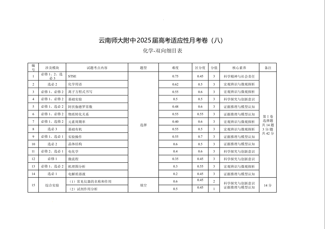 云南师大附中2025届高三下学期3月高考适应性月考卷(八)化学双向细目表