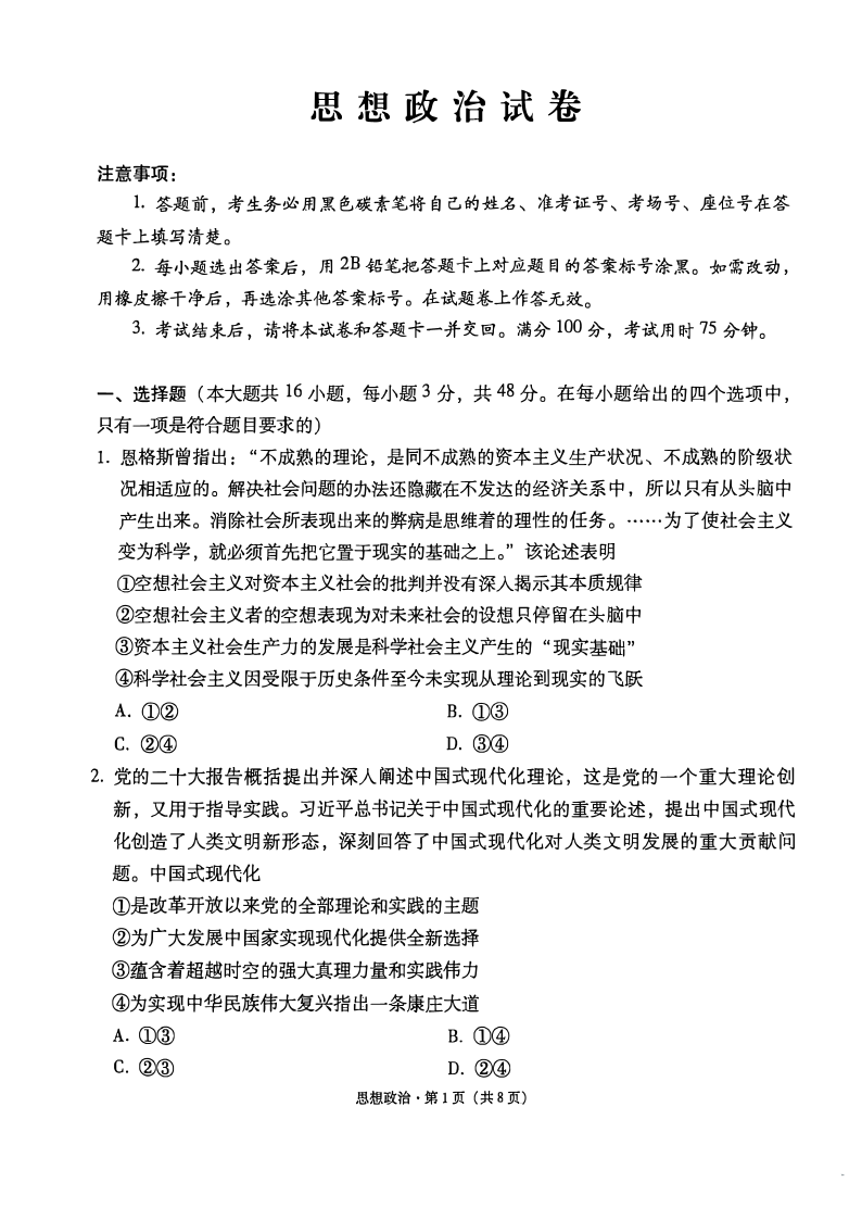 云南师大附中2025届高三下学期3月高考适应性月考卷(八)政治