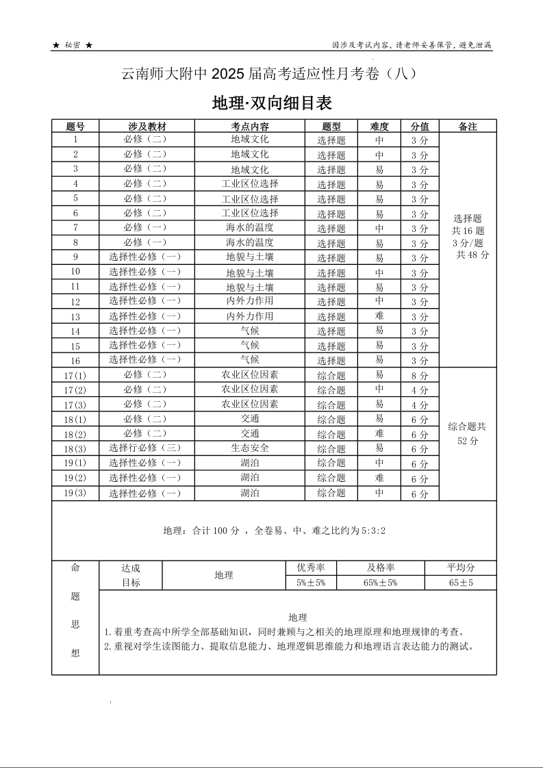 云南师大附中2025届高三下学期3月高考适应性月考卷(八)地理双向细目表